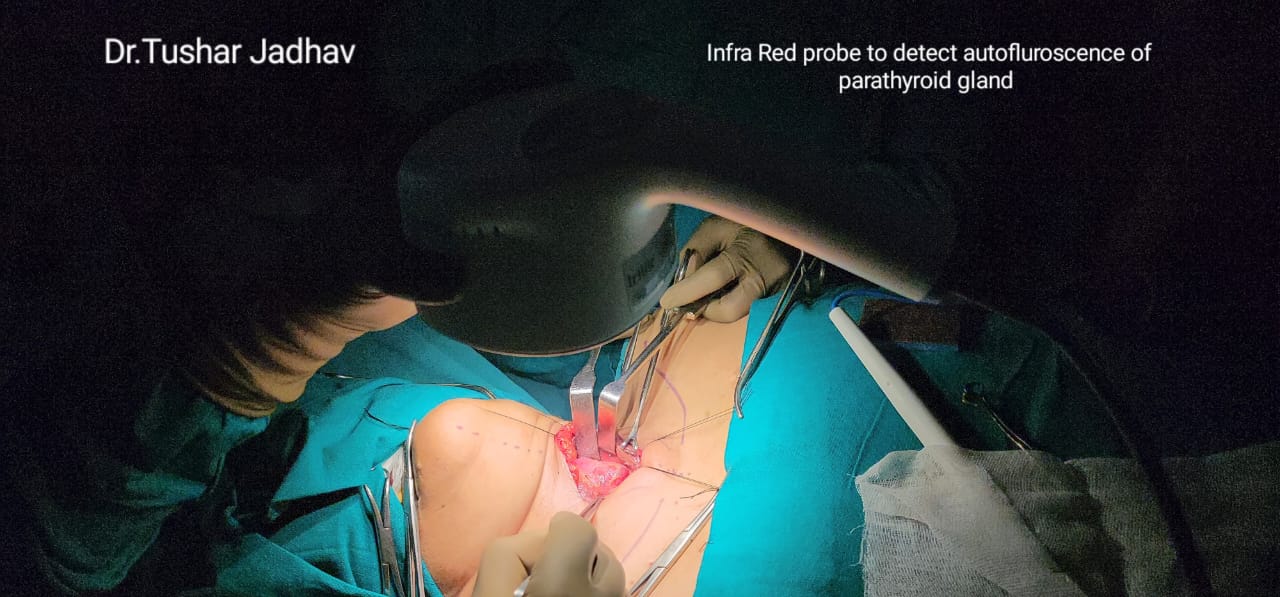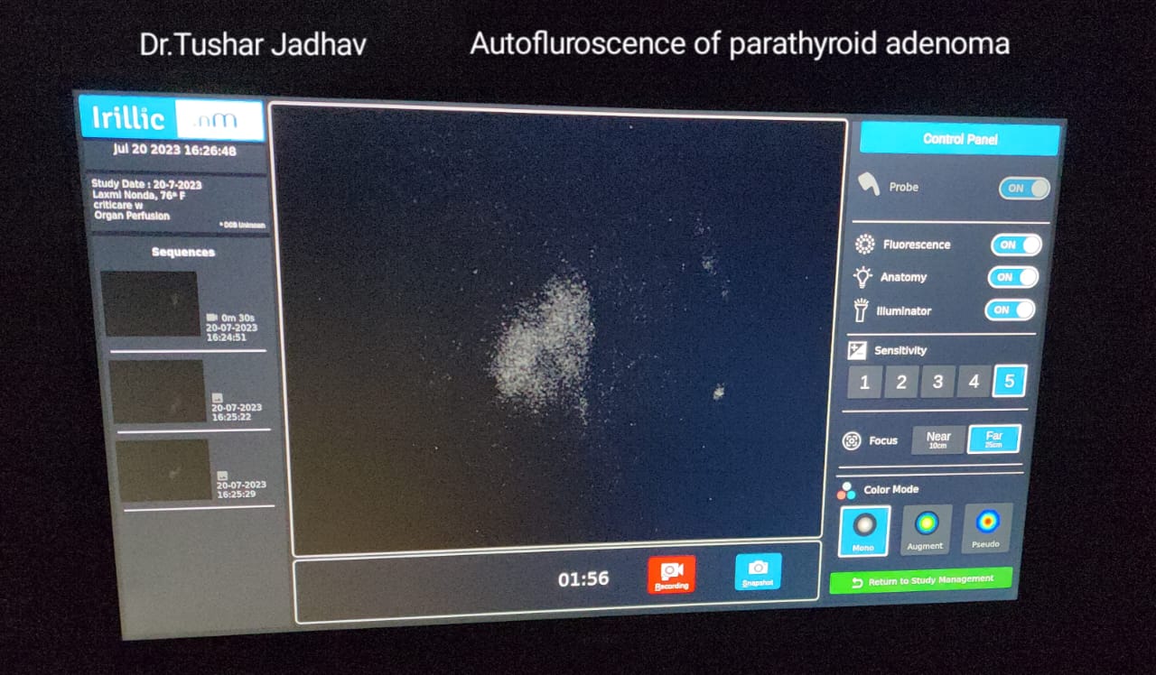 Parathyroid gland has its own indigenous fluorescence. ( autofluroscence ). It can be evident on infrared camera. Hyperplasia or adenomatous growth makes it brighter than normal gland. It's a nice tool to ease out the search of glands in the neck bed and to differentiate normal gland from adenomatous or hyperplastic one. This technology has proven a great help to surgeons for the precision and for assuring the completion of surgery in parathyroid adenomas. It's importance is felt especially when glands are not at their usual locations.
